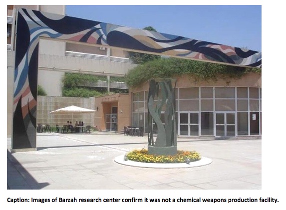 These are photos of the real Barzah Research Center. While it does have a science laboratory, nothing about it suggests that chemical weapons research was taking place. Most importantly, the facility was located in the greater Damascus area, which contradicts the military photos that show a facility that was destroyed in an entirely different relatively remote and mildly mountainous region: