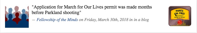 “Application for ‘March for Our Lives’ permit was made months before Parkland school shooting,” read the headline on Fellowship of the Minds, a website that pushes conspiracy theories and religious ideas.