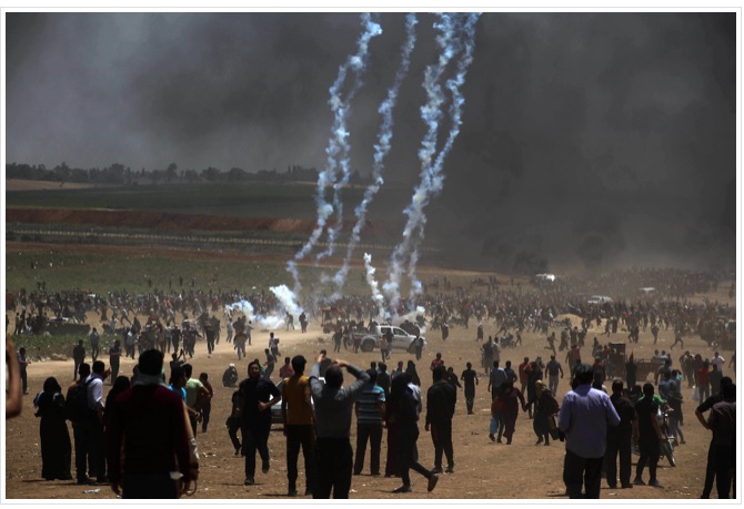 ZEITOUN, Gaza (Washington Post) 19 May by Loveday Morris — The first patients don’t come until 5:39pm. They crowd around the ambulance, choking on tear gas. Israeli soldiers, just a few hundred yards away on the other side of the boundary fence, had fired a volley of hissing cans at the protesters. Hussein al Sumeiri, a 31-year-old paramedic, hands out cotton wool treated with alcohol and saline for them to wipe their stinging eyes. One 10-year-old in jeans and a yellow T-shirt has tears streaming down his cheeks and is struggling for breath. He is brought inside the ambulance to be given oxygen. Sumeiri logs it as the day’s first injury. Friday was the quietest protest day of the past eight weeks for the paramedics in ambulance No. 414. The ‘Great March of Return’, as the demonstrations have been dubbed, reached their peak Monday … Medics like Sumeiri have witnessed the brunt of the violence. His ambulance treated more than 50 patients with gunshot wounds Monday. The medics have been in the line of fire themselves, with one paramedic among those killed Monday. They list the names of several colleagues who have been shot. The crowds are thin Friday, swelling only after late-afternoon prayers, when several busloads arrive. It’s the first day of Ramadan, the holy month when Muslims fast between sunrise and sunset, and temperatures are near a sweat-inducing 35°C [95°F]. The medics are working on empty … The day closes with just 56 injuries across Gaza, largely from tear gas, though some gunshot wounds are reported. A final volley of tear gas canisters lands farther back from the fence, where families have gathered in tents. Sumeiri’s brother-in-law calls to check. “A good day,” he reports back. “A day of gas.”