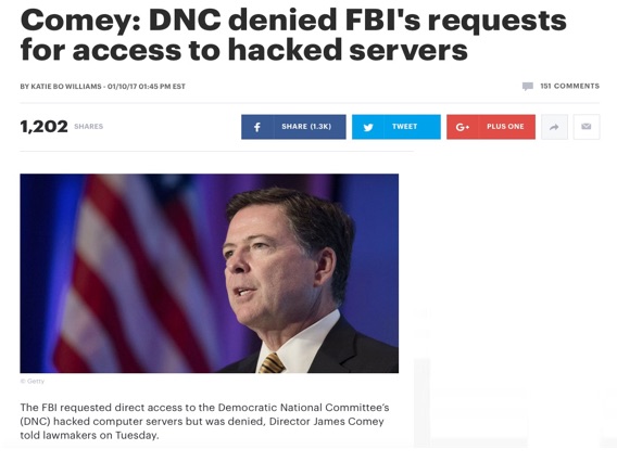 Even James Comey, on 10 January 2017, in The Hill, just a few days later, admitted, “Comey: DNC denied FBI’s requests for access to hacked servers”, the only explanation for which has to be that the DNC knew they would not find evidence of hacking.
