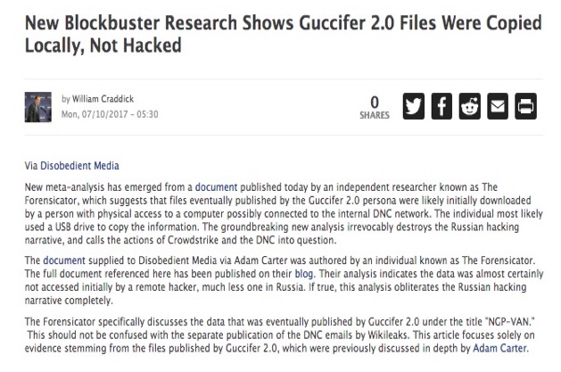 But back on 10 July 2017, William Craddick reported in Zero Hedge, “New Blockbuster Research Shows Guccifer 2.0 Files Were Copied Locally, Not Hacked”, based upon the rapidity with which they had been downloaded and that it happened in the Eastern Time Zone.