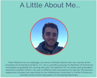 Michael Vabner, whose images as a child were used to create Sandy Hook fiction “Noah Pozner”, has a web site visited by my correspondent, Bruce Sullivan, and turns out to have just graduated from the University of Connecticut, Storrs (2017) with courses in IT and web management. I visited his web site (which as of now can still be accessed here) and captured this, a photograph of “Noah Pozner”, all grown up: