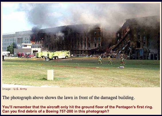 challenge the official account of 9/11, including his web site, “Hunt the Boeing”, and two books, Pentagate (2002) and 9/11: The Big Lie (2002). Here is one of many photographs featured on his blog that demonstrate no Boeing 757 hit the Pentagon and that the official account of 9/11 is, indeed, “a big lie”: