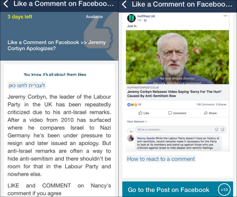 The app told users to comment on Facebook in response to a Huffington Post UK story about Corbyn’s alleged “anti-Israel remarks,” which it claimed were “often a way to hide anti-Semitism.”