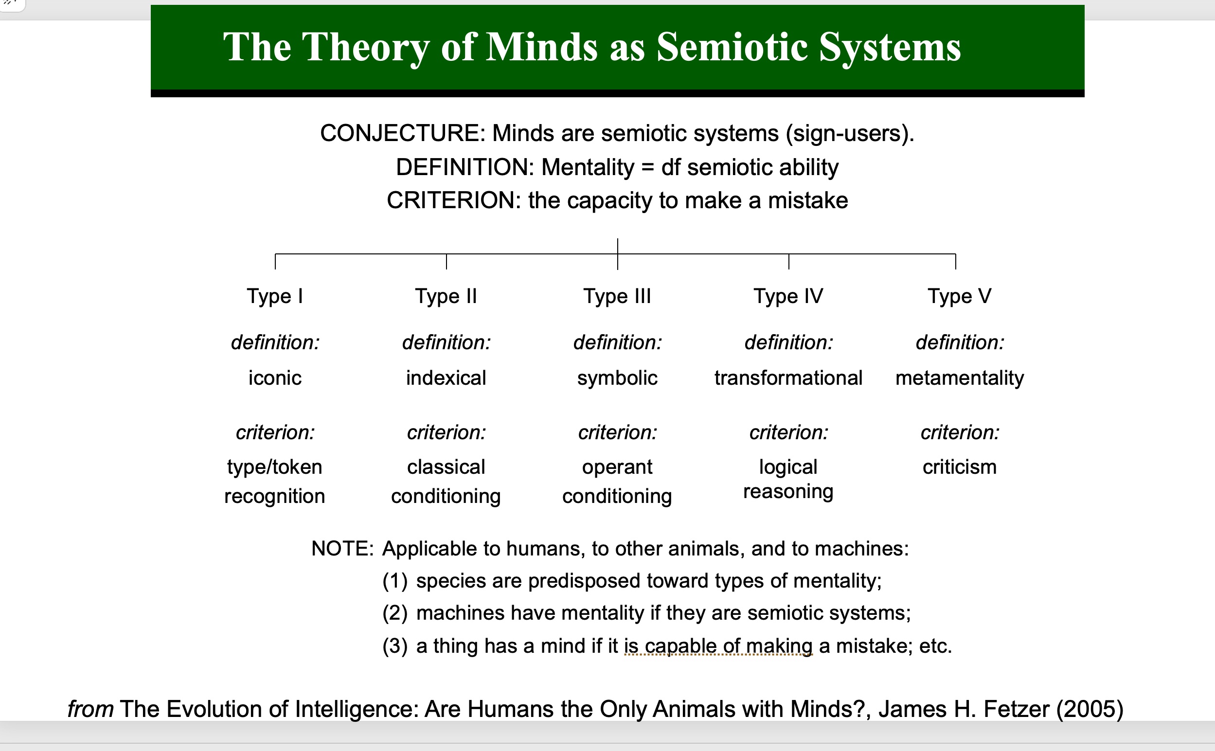 As I replied at the time, your argument is that normative (moral) behavior would violate the laws of evolution and therefore represents mere wishful thinking from a Darwinian point of view. That would be true but for the development of human minds from their animal precursors which enable humans to contemplate possible situations that differ from present circumstances, some of which may represent more desirable circumstances than others. As I explain in The Evolution of Intelligence (2005) — which I would love for him to critique — there are kinds (or levels) of minds as semiotic (or sign-using) systems from iconic sign-using minds to indexical sign-using minds to symbolic sign-using minds and higher, including the capacity for reasoning and (at the highest level) the use of signs to criticize other uses of signs as meta-mentality. See