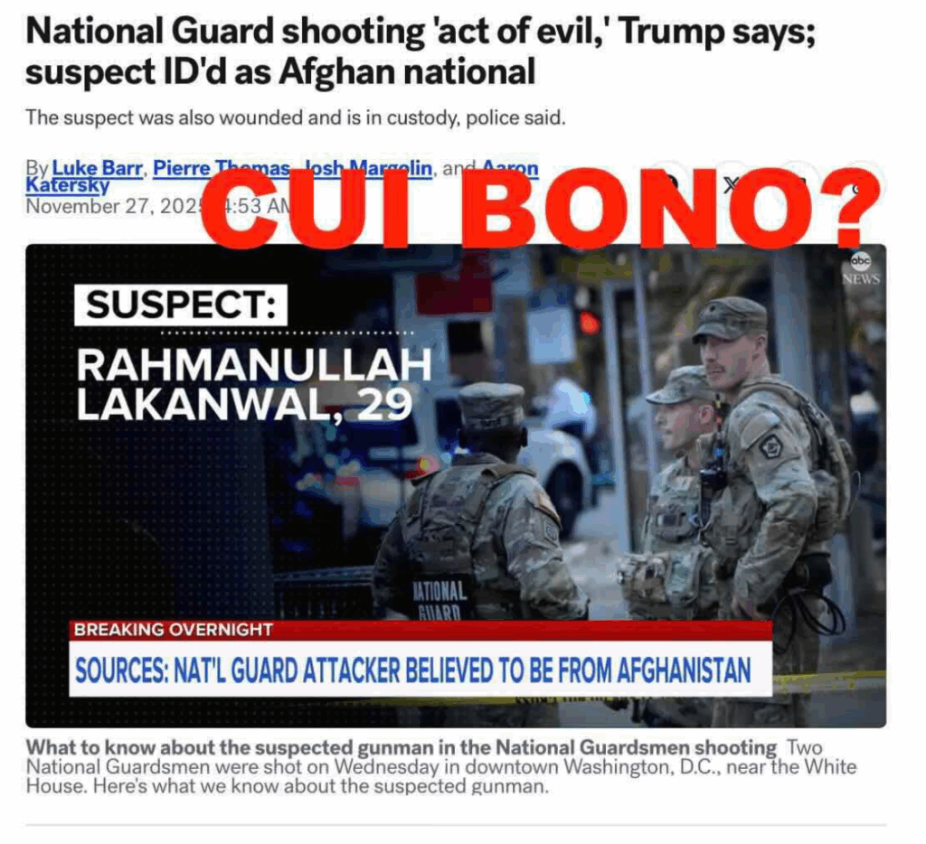 *CUI BONO? Trump called the attack on “terrorism,” meaning it was a strategically-conceived violent act against civilians (?) designed to accrue political gain for the perpetrators. (That’s the definition of terrorism, which has been an all-too-common military tactic throughout thousands of years of history.) But since all terrorism is strategic, what, specifically, was the strategic purpose of whoever was behind this shooting? The question answers itself: Trump and his agenda were the primary beneficiaries. The President got to bloviate on Thanksgiving Eve, calling the shooter an “animal,” while posing as the protector of the nation in general and its capital in particular. His order to send the National Guard to Washington DC seems vindicated by the purported “radical Afghan Muslim terror attack.” (Hegseth used the attack as an excuse to send 500 more guardsmen into DC.) And Trump’s anti-immigration agenda got a huge boost as Trump was handed an excuse to issue an order: “Processing of all immigration requests relating to Afghan nationals is stopped indefinitely pending further review of security and vetting protocols.”