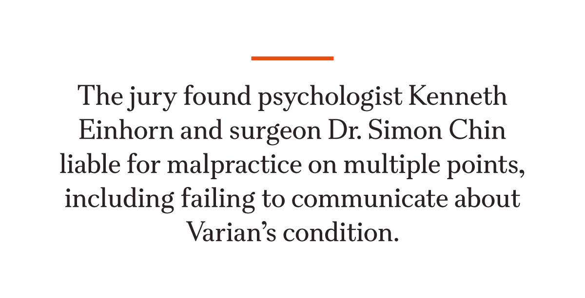 The jury found Einhorn and surgeon Dr. Simon Chin liable for malpractice on multiple points, including failing to communicate about Varian’s condition. For example, an October 2019 letter Einhorn wrote to Chin in support of Varian’s surgery contained errors and omitted certain coexisting mental issues, such as autism and depression.