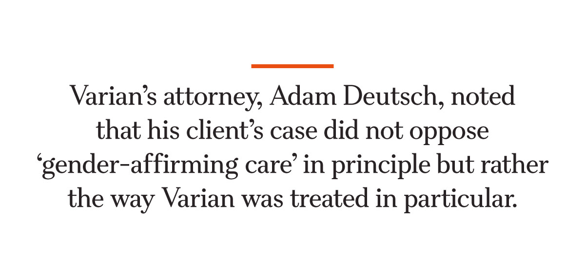 Varian’s attorney, Adam Deutsch, noted that his client’s case did not oppose “gender-affirming care” in principle but rather the way Varian was treated in particular.