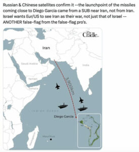 The anticipated false flag has been launched by Israel. Iran was blamed for missiles targeting Diego Garcia, the UK-US military base near Iran, but in reality those missiles came not from Iran, but from a submarine in the Indian Ocean.